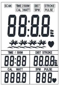 Das obere Fenster zeigt im sogenannten Scan-Modus automatisch im 500-Sekunden-Takt nacheinander die wichtigsten Trainingswerte: Zeit, Zeit/500 m, Distanz, Schlagzahl, Kalorien, Watt, SPM und Puls. Drückt man die MODE-Taste kann man zwischen dem Scan und der gezielten Einzelanzeige einer gewünschten Kennzahl wechseln – ideal für Ruderer, die sich auf bestimmte Metriken fokussieren wollen.
