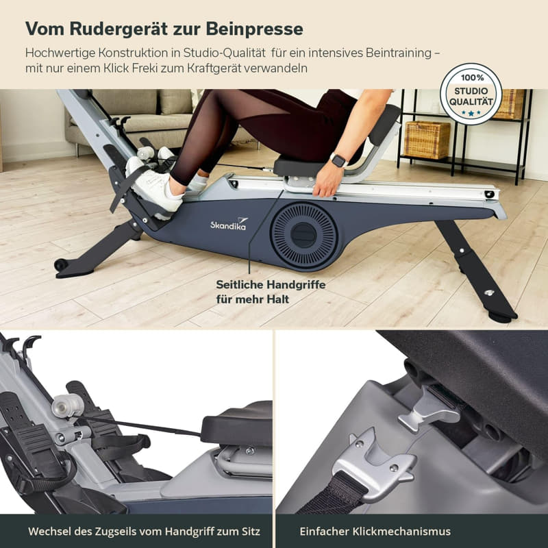 Die integrierte Beinpresse-Funktion stellt eine Besonderheit dar, die das Skandika Freki Plus deutlich von klassischen Rudergeräten abhebt und die den Funktionsumfang um eine zusätzliche Trainingsoption für die Beinmuskulatur erweitert. Technisch wird die Beinpresse realisiert, indem das Zugseil am Sitz durch einen Klickmechanismus fixiert wird, sodass der Sitz selbst als Widerlager dient. Der Nutzer positioniert die Füße auf den Fußstützen und drückt sich kontrolliert nach hinten ab, ähnlich wie bei einer klassischen Beinpresse, jedoch in horizontaler Ausführung. Der Widerstand entsteht dabei ausschließlich über den magnetischen Bremsmechanismus des Geräts.
